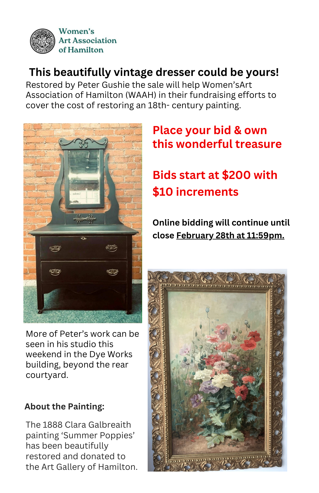 The Women's Art Association of Hamilton (WAAH) provides a venue for women artists and art lovers to share their appreciation of visual arts in a mutually supportive atmosphere. We welcome you to become involved in our association as an active member and to share your talents, knowledge and expertise by joining one of our committees and by being a volunteer at one of our events.